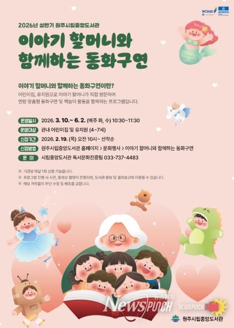 뉴스펀치 조평훈 기자 | 원주시립중앙도서관은 오는 3월부터 관내 어린이집과 유치원을 대상으로 ‘이야기 할머니와 함께하는 동화구연’ 프로그램을 운영한다.