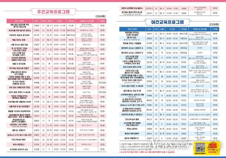 특히 이번 프로그램은 특정 분야에 편중되지 않도록 문화·취미·실생활 역량을 고르게 아우르는 균형있는 구성에 중점을 두었다. 기존 인기 강좌는 안정적으로 운영하는 한편, 다양한 신규 강좌를 함께 편성해 군민들의 선택 폭을 넓혔다.