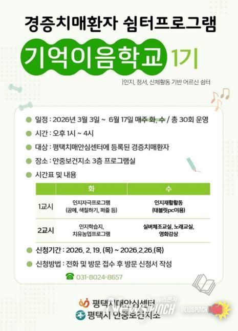 뉴스펀치 박상훈 기자 | 평택시 안중보건지소는 경증 치매 환자의 인지기능 유지와 일상생활 지원을 위해 오는 3월 3일부터 6월 17일까지 경증 치매 환자 쉼터 프로그램 ‘기억이음학교 1기’를 운영한다.