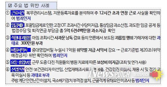이와 함께 연장·야간·휴일근로 수당 등 임금 미지급 5억 6천4백만원에 대해서도 시정지시했다.