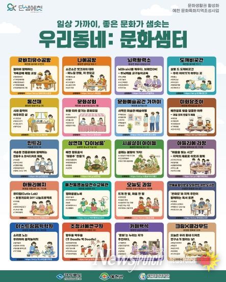 뉴스펀치 박세훈 기자 | (재)예천문화관광재단은 ‘문화특화지역 조성사업’의 일환으로 추진 중인 ‘우리동네 문화샘터’의 공간별로 세부 프로그램 공개, 오는 28일까지 참여자를 모집한다.