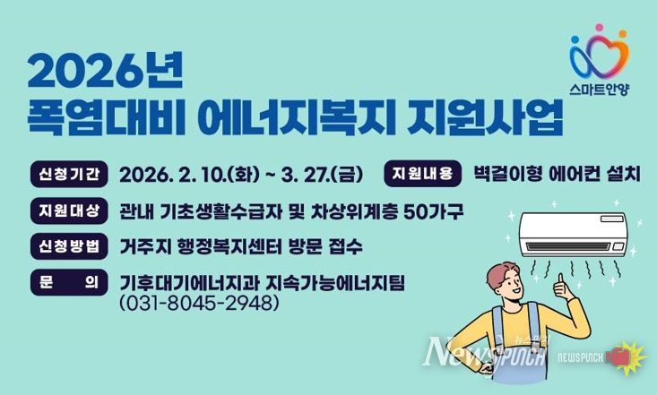 뉴스펀치 박상훈 기자 | 안양시는 다가오는 여름철 폭염에 대비해 저소득 취약계층을 대상으로 벽걸이형 에어컨을 설치해 주는 ‘2026년 폭염 대비 에너지복지 지원사업’을 추진 중이라고 18일 밝혔다.