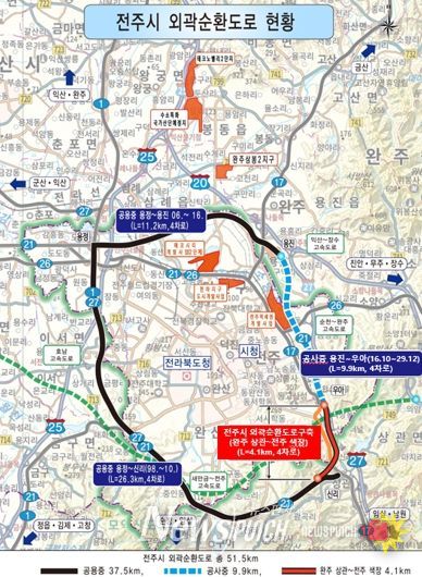 현재까지 완주 신리~전주 용정~용진을 잇는 37.5km 구간은 사업비 7,149억원을 들여 개통 운영 중이며, 전주 용진~우아(색장동) 9.9km 구간은 사업비 3964억 원을 들여 2029년 준공을 목표로 공사가 진행 중이다. 하지만 완주 상관~전주 색장 구간은 아직 착수 단계에 이르지 못해 외곽순환망의 기능이 반쪽에 그치고 있다는 지적이 이어져 왔다.