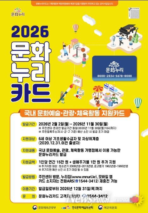 경제적 소외계층의 문화격차 완화와 삶의 질 향상을 위한 통합문화이용권(문화누리카드)은 1인당 연간 15만원으로, 청년의 문화향유 기회를 제공하는 청년문화예술패스는 1인당 연간 20만원으로 각각 인상한다.