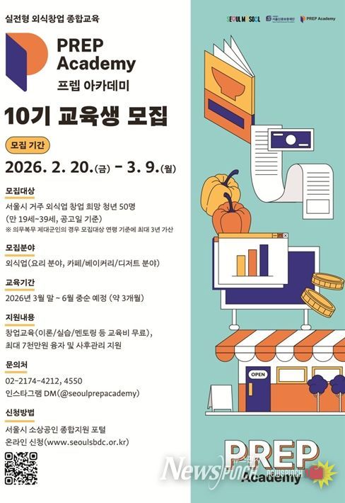 뉴스펀치 박상훈 기자 | 서울시가 청년들의 ‘준비된 창업’을 돕기 위해 교육부터 초기자금 연계, 사후관리까지 전 과정 지원에 나선다. 서울시는 2021년 시작된 외식업·베이커리·식음료 분야 예비 창업 청년 대상 ‘프렙 아카데미’ 정규과정 10기 교육생을 2월 20일 10시부터 3월 9일 16시까지 모집한다고 밝혔다.