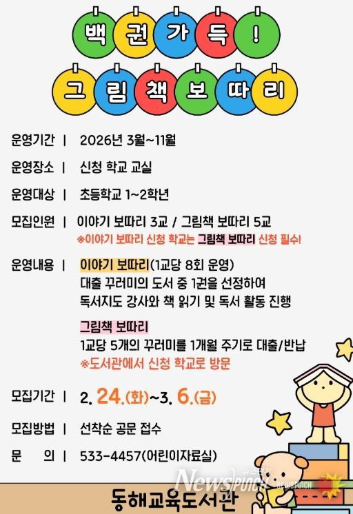 동해교육도서관은 3월부터 11월까지 초등학생들이 독서에 흥미를 느끼고 평생 독자로 성장할 수 있는 기반을 마련하고자 ‘백 권 가득! 그림책 보따리’ 프로그램을 운영한다고 밝혔다.