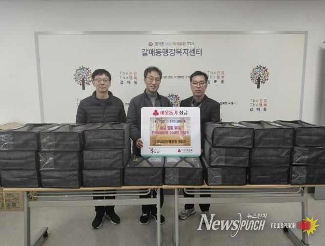 뉴스펀치 박상훈 기자 | 구리시 갈매동 행정복지센터는 지난 2월 13일 구리시립노인전문요양원으로부터 한우 국거리와 사골국물 20세트를 후원받고 설 명절맞이 후원 물품 전달식을 가졌다.