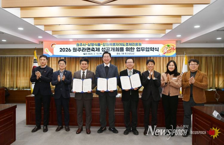 뉴스펀치 조평훈 기자 | 원주시는 ‘2026 원주라면축제’의 성공적인 개최를 위해 19일 오후 2시, 시청 7층 투자상담실에서 삼양식품, 강원특별자치도경제진흥원과 업무협약을 체결했다.