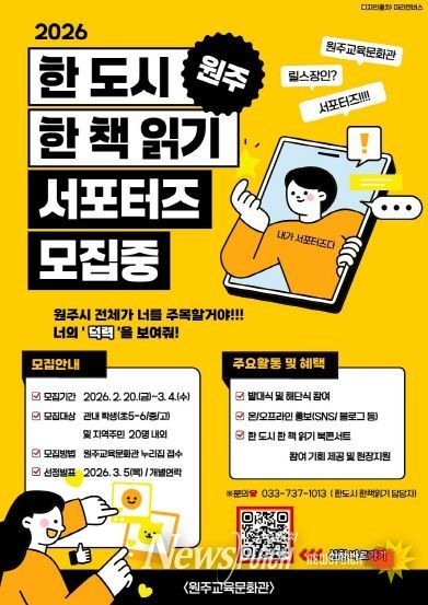 뉴스펀치 조평훈 기자 | 강원특별자치도교육청원주교육문화관은 지역 독서 문화 확산과 시민 참여 확대를 위해 ‘2026년 원주 한 도시 한 책 읽기 서포터즈’를 운영한다.