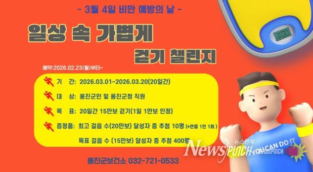 뉴스펀치 정홍균 기자 | 옹진군은 군민의 일상 속 걷기 실천을 유도하고 비만 예방과 건강생활 실천 분위기 조성을 위해 3월 1일부터 20일까지 운영되는 '일상 속 가볍게 걷기'챌린지 참가자를 23일부터 모집한다고 밝혔다.