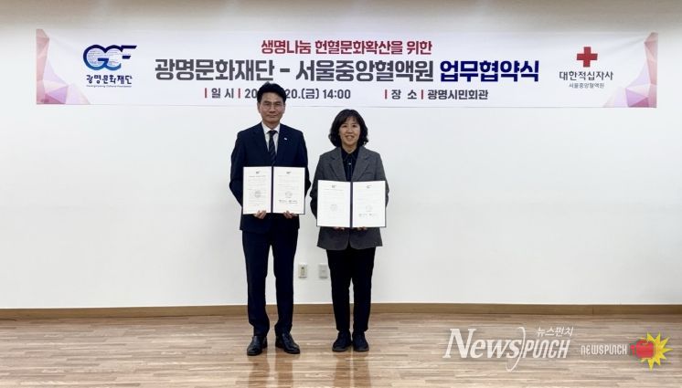 뉴스펀치 박상훈 기자 | (재)광명문화재단(대표이사 송은영)은 서울중앙혈액원(원장 이재용)과 함께 2월 20일 오후 2시에 광명시민회관에서 '헌혈자 대상 문화예술 프로그램 제공 및 헌혈 문화 정착을 위한 업무협약'을 체결했다고 밝혔다.