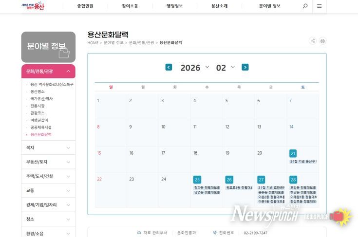 뉴스펀치 박상훈 기자 | 서울 용산구는 용산구와 용산문화원, 용산역사박물관 등 유관 기관이 운영하는 다양한 문화행사 정보를 한눈에 확인할 수 있는 온라인 기반 ‘용산문화달력’을 구축하고, 2월부터 정식 운영한다고 밝혔다.