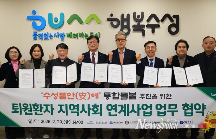 뉴스펀치 조평훈 기자 | 대구 수성구는 지난 20일 통합돌봄 추진을 위한 ‘퇴원환자 지역사회 연계사업’ 참여 의료기관인 천주성삼병원, 더좋은병원, 시지노인전문병원, 스위스요양병원, 수성요양병원과 업무협약을 체결했다고 밝혔다.