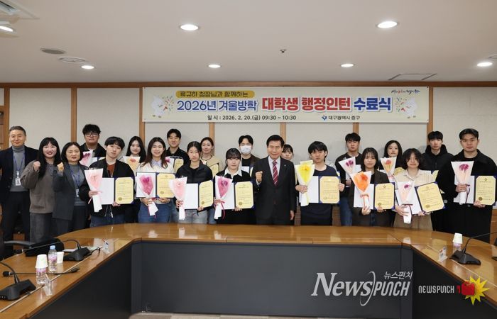 뉴스펀치 조평훈 기자 | 대구 중구는 지난 20일 구청 상황실에서 ‘2026년 겨울방학 대학생 행정인턴 수료식’을 개최했다.
