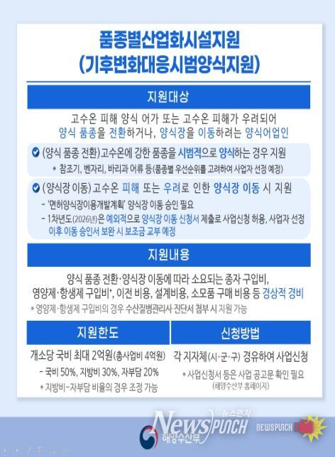 뉴스펀치 정홍균 기자 | 해양수산부는 기후변화에 선제적으로 대응하고 어가의 소득 안정을 도모하기 위해 2월 23일부터 3월 31일까지 ‘2026년 기후변화 대응 시범 양식 지원사업’ 대상 어가를 공모한다고 밝혔다.