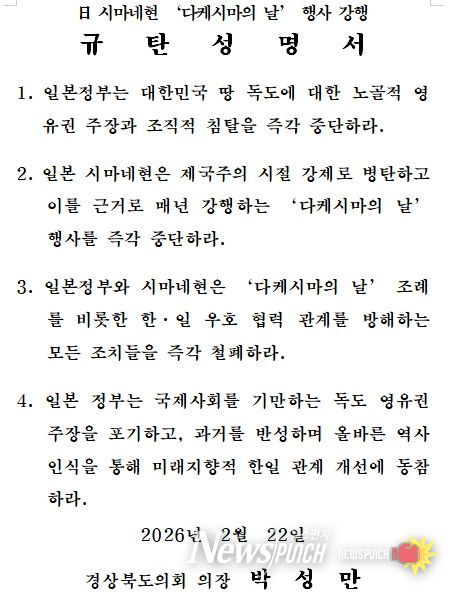 뉴스펀치 박세훈 기자 | 경상북도의회는 일본 시마네현이 2월 22일 이른바 ‘다케시마의 날’ 행사를 개최한 데 대해 깊은 유감을 표명하며, 독도에 대한 부당한 인식을 담고 있는 ‘다케시마 조례’의 즉각적인 폐기를 촉구하는 성명을 발표했다.