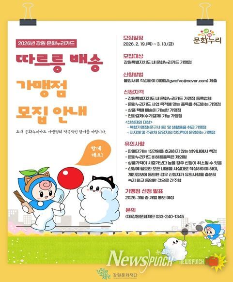 뉴스펀치 조평훈 기자 | 강원문화재단은 도내 문화누리카드 가맹점을 대상으로 2026년 통합문화이용권 이용지원 서비스 ‘따르릉 배송’ 참여 업체를 3월 13일까지 모집한다.