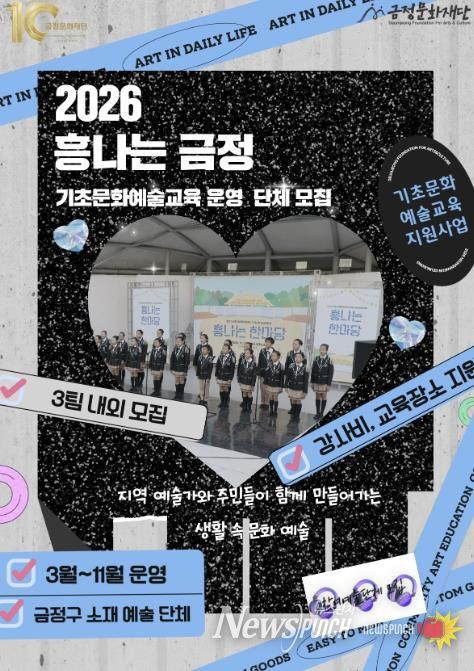 뉴스펀치 김윤걸 기자 | (재)금정문화재단은 2026 금정 기초 문화예술 교육 지원사업 '흥나는 금정' 프로그램의 참여 예술단체를 오는 2월 23일부터 2월 27일까지 모집한다고 밝혔다.