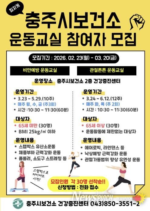 뉴스펀치 이현승 기자 | 충주시 보건소는 시민들의 건강한 생활 습관 형성과 활기찬 일상 회복을 위해 ‘2026년 상반기 운동교실’ 참여자를 오는 3월 20일까지 모집한다고 23일 밝혔다.