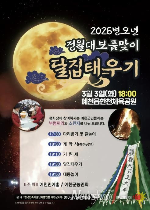 뉴스펀치 박세훈 기자 | 예천군은 오는 3월 3일 오후 5시 30분에 예천읍 한천체육공원에서 ‘2026년 병오년 정월대보름 달집태우기 행사’를 개최한다고 밝혔다.