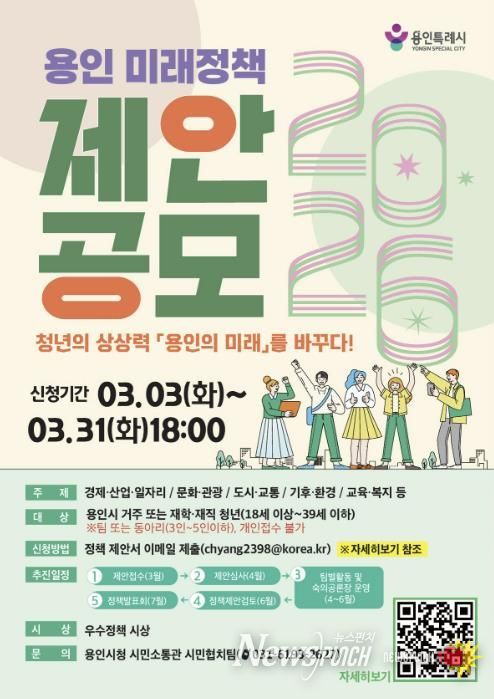 시 관계자는 “청년의 창의적인 시각이 숙의 과정을 통해 구체적이고 실행력 있는 정책으로 발전하는 데 이번 공모전의 의미가 있다”며 “용인의 미래를 함께 설계할 청년들의 적극적인 참여를 기대한다”고 말했다.