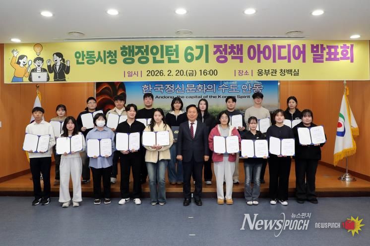 뉴스펀치 박세훈 기자 | 안동시는 2월 20일 시청 청백실에서 제6기 행정인턴 정책 아이디어 발표회를 개최하고, 두 달간의 인턴 활동을 마무리하는 시간을 가졌다. 이번 발표회는 시청 각 부서 및 유관기관에 배치돼 근무한 인턴들이 현장에서 경험한 내용을 바탕으로 정책 제안을 공유하기 위해 마련됐다.