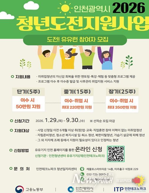 뉴스펀치 정홍균 기자 | 인천광역시는 청년의 경제활동 참여와 노동시장 진입을 지원하기 위해 ‘청년도전지원사업’ 참여자를 1월 29일부터 9월 30일까지 모집한다고 밝혔다.