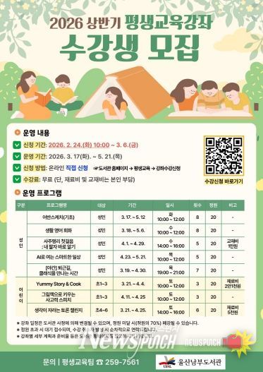 뉴스펀치 김윤걸 기자 | 울산광역시교육청 소속 도서관들이 초등학생과 지역 주민의 자기 계발을 돕고자 ‘2026년 상반기 평생교육 프로그램’ 수강생을 모집한다.