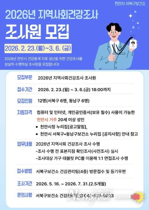 뉴스펀치 이현승 기자 | 천안시는 내달 6일까지 ‘2026년 지역사회건강조사’를 수행할 조사원을 모집한다고 23일 밝혔다.