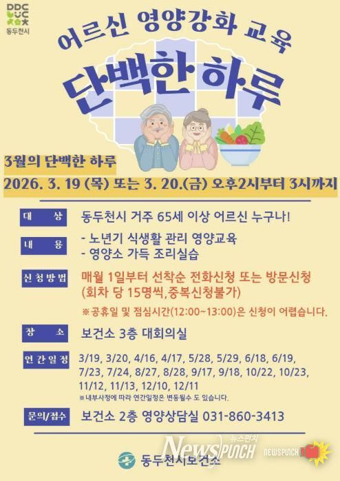 뉴스펀치 박상훈 기자 | 동두천시보건소는 65세 이상 어르신의 건강한 노후생활을 지원하기 위해 영양강화 교육 '단백한 하루'를 오는 3월부터 운영한다고 밝혔다.