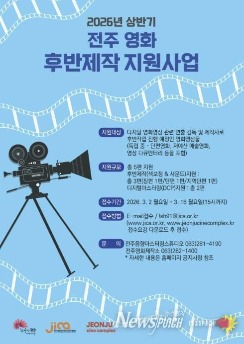 (재)전주정보문화산업진흥원과 전주영화제작소는 오는 3월 16일까지 대한민국 독립영화 제작 환경개선과 우수 작품을 발굴하기 위한 ‘2026년 상반기 전주 영화 후반제작지원 사업’에 참여할 작품을 공개 모집한다고 23일 밝혔다.
