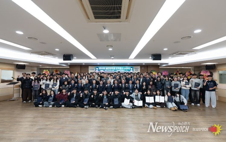 뉴스펀치 김윤걸 기자 | (재)부산진구장학회(이사장 김윤환)는 20일 대학생과 고등학생 장학생을 대상으로 제30회 장학증서 수여식을 개최했다. 장학회는 1997년 제1회 장학금 지급을 시작으로 올해까지 30년째 장학사업을 이어오고 있다. 올해는 총 80명의 장학생(대학생 43명, 고등학생 37명)을 선발해 약 1억9천만 원의 장학금을 지급했으며, 지금까지 2천400여 명의 장학생을 배출하고 누적 장학금 규모는 45억 원을 넘어섰다. 이번 수여식에서는 지역인재장학생 2명에게 1인당 500만 원을 지급했으며, 일반장학생에게는 대학생 1인 350만 원, 고등학생 1인 100만 원의 장학금을 전달했다.