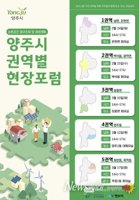 뉴스펀치 박상훈 기자 | 양주시가 오는 24일부터 3월 17일까지 5차례에 걸쳐 ‘농촌공간 재구조화 및 재생 기본계획’ 수립을 위한 권역별 주민현장포럼을 개최할 예정이다.