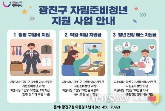 지원대상은 광진구에 3개월 이상 주민등록을 두고 거주하는 자립준비청년이다. 주용 지원 내용은 ▲정장 구입비 지원 20명(1인 최대 60만 원) ▲학업·취업 준비 수강료 지원 20명(1인 최대 50만 원, 응시료·교재비 포함) ▲종합검진비 지원 10명(1인 최대 30만 원)이다.