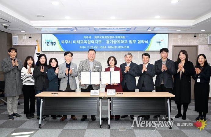뉴스펀치 박상훈 기자 | 경기도파주교육지원청은 2026년 2월 23일에 파주시와 ‘파주시 미래교육협력지구–경기공유학교’ 업무협약을 체결했다.