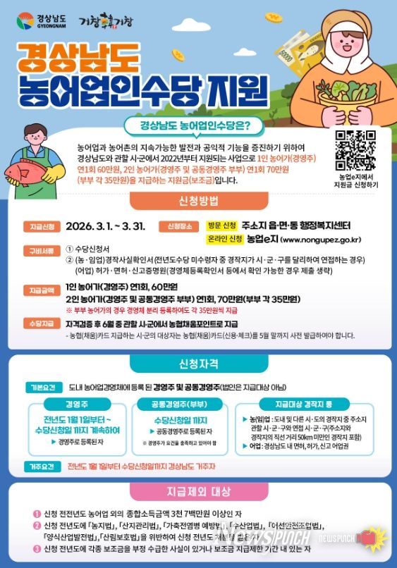 2025년 1월 1일부터 수당 신청일까지 경상남도에 계속해 주소를 두고, 같은 기간 농어업경영체에 등록한 농어가면 신청 가능하다. 단, 공동경영주의 경우 경영주가 거주·종사 요건을 충족하여야 한다.