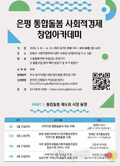 뉴스펀치 박상훈 기자 | 서울 은평구는 다음 달 9일까지 지역 내 일상생활 돌봄 서비스를 제공할 사회적경제기업 창업 주체를 발굴·육성하기 위해 ‘은평 통합돌봄 사회적경제 창업 아카데미’ 참가자를 모집한다고 밝혔다.