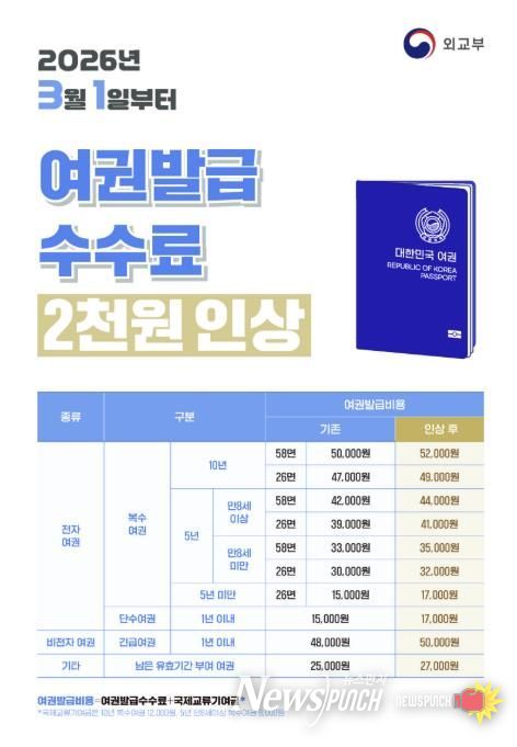 이번 조정은 2026년 3월 1일 접수되는 여권 신청 건부터 적용되며, 세부 수수료 금액은 여권 종류(복수‧단수) 및 유효기간에 따라 달라진다.