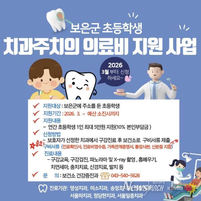 지원 대상은 보은군에 주소를 둔 초등학생 전 학년으로, 보호자 동의 후 참여할 수 있다. 학생 1인당 연간 최대 5만원까지 치과진료비를 지원하며, 10%의 본인부담금이 발생한다. 의료비는 지원 기준에 따라 3월부터 지급될 예정이다.