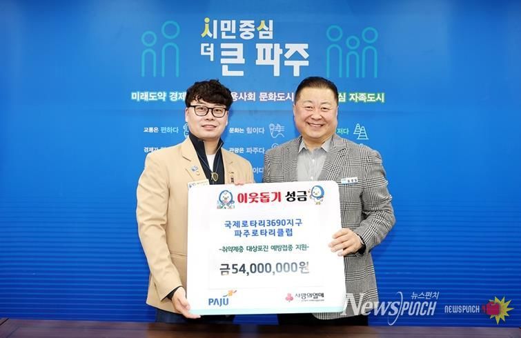 뉴스펀치 박상훈 기자 | 파주시는 23일 ‘국제로타리 3690지구 파주로타리클럽’으로부터 60세 이상 취약계층을 위한 5,400만 원 상당의 대상포진 사백신을 지원받았다고 밝혔다.