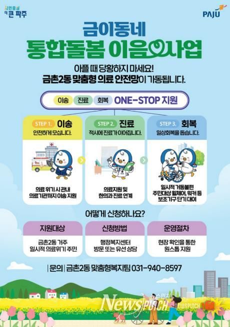 뉴스펀치 박상훈 기자 | 파주시 금촌2동은 의료·돌봄 공백을 줄이기 위한 ‘통합돌봄 이음 서비스’를 3월부터 본격 가동한다. 긴급 상황에서 병원까지 가지 못해 치료 시기를 놓치거나, 진료 이후 회복 단계에서 돌봄이 끊기는 문제를 줄이겠다는 취지다.