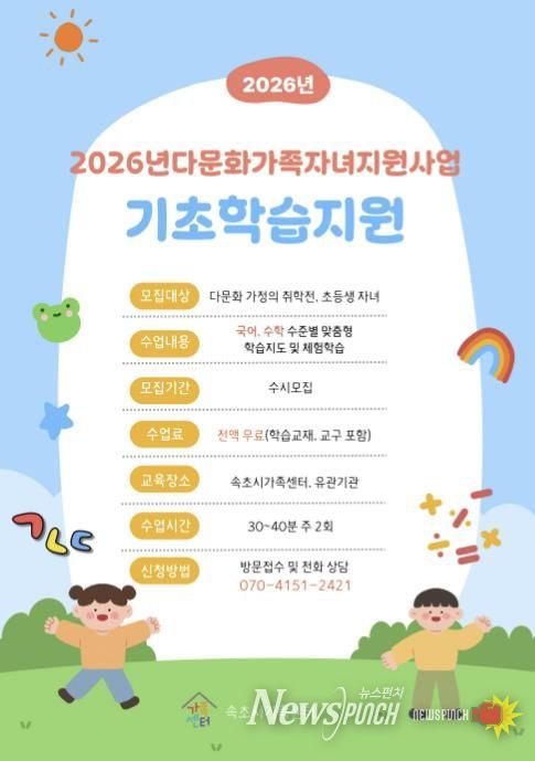 뉴스펀치 조평훈 기자 | 속초시가족센터는 다문화가족 자녀들의 안정적인 학교생활 적응과 기초학력 증진을 위해 ‘2026년 다문화가족 자녀 기초학습지원사업’을 본격적으로 추진한다.