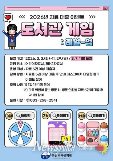 뉴스펀치 조평훈 기자 | 춘천교육문화관은 3월, 7월, 11월 춘천교육문화관 이용자를 대상으로 자료 대출 이벤트 ‘도서관 게임: 독서 레벨-업’을 운영한다.