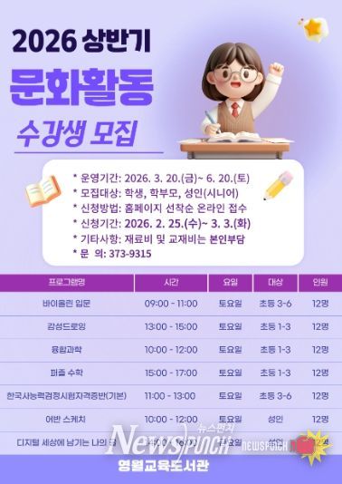 뉴스펀치 조평훈 기자 | 영월교육도서관은 3월 20일부터 6월 20일까지, 2026년 상반기 문화활동 강좌를 운영한다.
