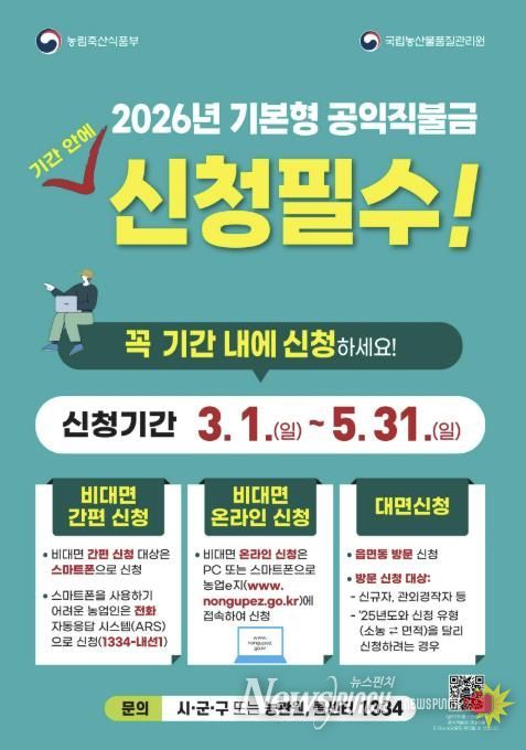 뉴스펀치 박상훈 기자 | 부천시는 3월 1일부터 5월 31일까지 2026년 기본형 공익직불금 신청을 받는다. 이번 신청은 관내 농업인을 대상으로 진행하며, 기간 내 신청한 대상자에 대해 자격요건 검증을 거쳐 직불금을 지급할 계획이다.