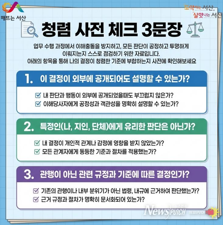 뉴스펀치 이현승 기자 | 서산시 기술보급과는 주요 의사결정 과정에서 이해충돌을 예방하고 공정하고 투명한 업무 기반을 강화하기 위해 ‘청렴 사전[事前] 체크 3문장’ 시책을 추진한다.