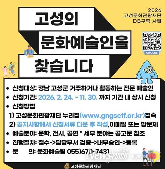 뉴스펀치 박세훈 기자 | (재)고성문화관광재단은 지역 예술인 정보의 통합적·체계적 관리 기반을 마련하고 문화예술 지원사업의 효율적 운영을 도모하기 위해 '2026 지역 예술인 DB 등록·구축 사업'을 추진한다.