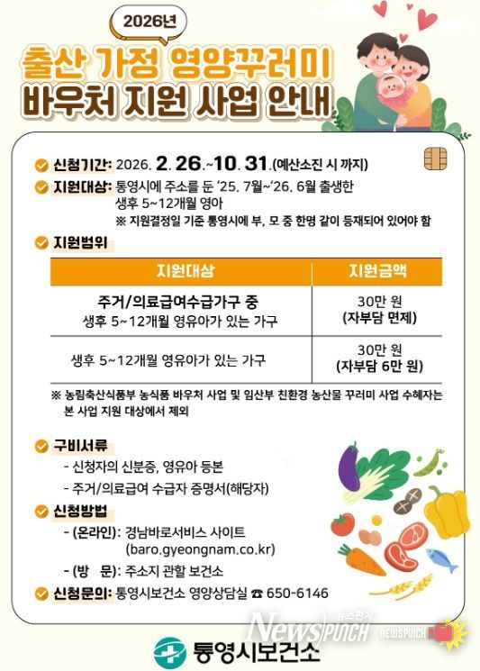 뉴스펀치 박세훈 기자 | 통영시는 영아의 건강한 성장·발달 도모 및 출산 가정의 경제적 부담을 완화하기 위해 2026년 신규사업으로 '출산 가정 영양꾸러미 바우처 지원사업'을 시행한다고 24일 밝혔다.
