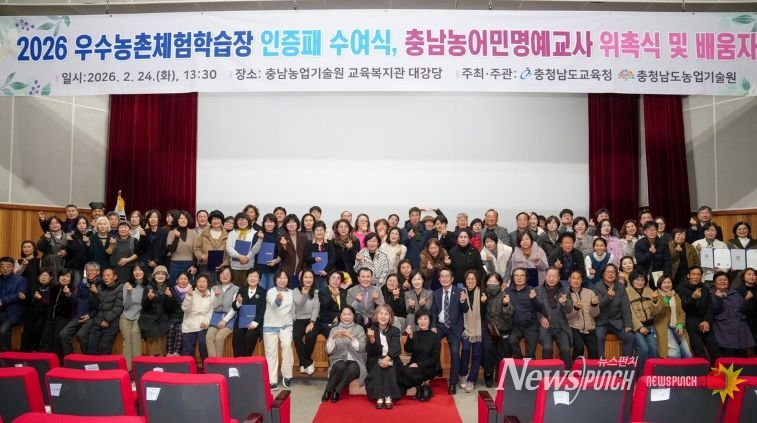 뉴스펀치 이현승 기자 | 충남교육청은 24일 충청남도농업기술원(예산)에서 우수 농촌체험학습장 인증패 수여식 및 농어민명예교사 위촉식과 배움자리를 농촌체험학습장 대표, 충남농어민명예교사, 충남농업기술원 관계자 180명이 참석한 가운데 개최했다고 밝혔다.