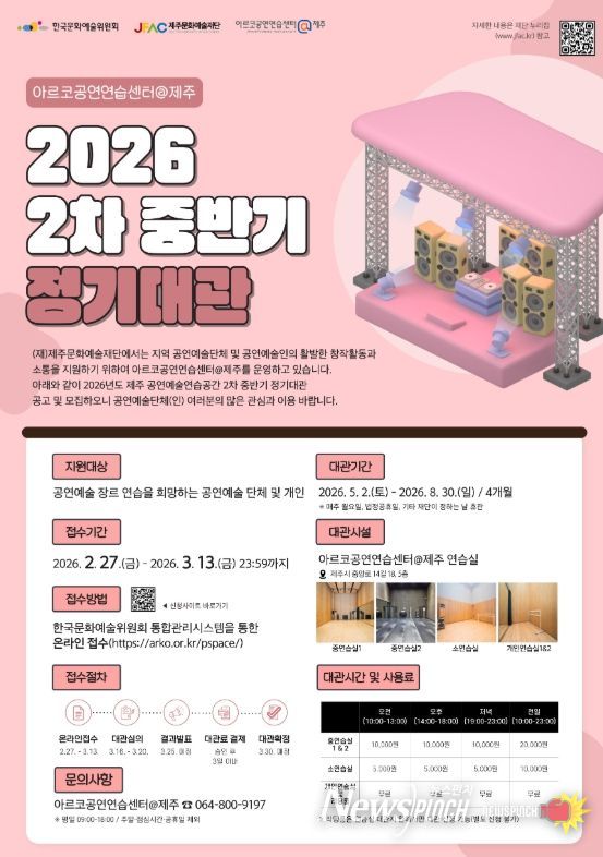 뉴스펀치 김용희 기자 | 제주문화예술재단(이사장 김석윤)은 공연예술 장르 연습을 희망하는 예술가(단체)를 대상으로 『아르코공연연습센터@제주』 2026년 2차 중반기(5월~8월) 정기대관 공모를 2월 27일부터 3월 13일까지 진행한다.